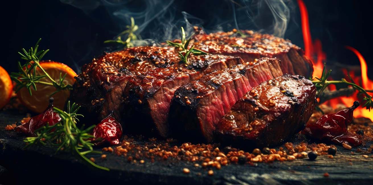 auf Zitrusfrüchten mit Chimichurri-Sauce, Zwiebeln, Paprika, Champignons, Coleslaw und Smashed Potatoes.