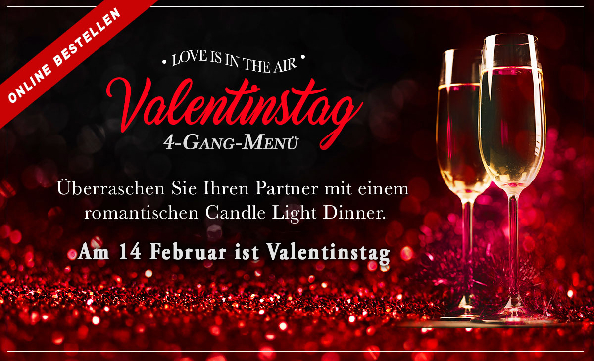 Valentinstag am 14.02. -  Freuen Sie sich auf einen romantischen Abend bei Kerzenschein. Ab 19:00 Uhr begrüßen wir Sie mit einem Aperitif, anschließend genießen Sie ein exklusives 4-Gänge-Menü – inklusive süßem Finale aus unserer Hofbäckerei. Jetzt online Bestellen