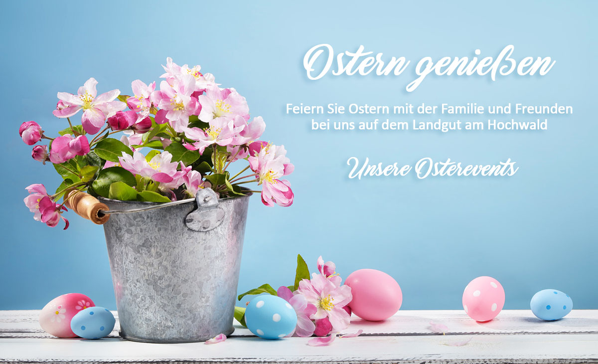 Nehmen Sie sich zu Ostern eine Auszeit und feiern Sie die Feiertage bei uns auf dem Landgut. An allen Ostertagen haben wir für Sie geöffnet und servieren Ihnen sowohl unsere à-la-carte-Karte als auch unsere besonderen Oster-Menüs. Reservieren Sie am besten rechtzeitig – wie jedes Jahr sind wir häufig schon früh ausgebucht.